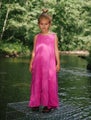 Suloinen ja pehmeä, pitkän mallinen musliinimekko. Väri kaunis bubblegum pink. Monikäyttöinen mekko kevään ja kesän juhliin tai arkeen kauniina kesäpäivänä. Ihanan ilmava ja mukavan kevyt lapsen päällä. Takana niskassa yksityiskohtana kaksi nappia. Huom. reilu mitoitus.
