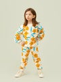 Luomupuuvillaisissa collegehousuissa on Happy Blooms-painokuosi, säädettävä joustovyötärö sekä resorit lahkeensuissa. Koko vastaa tuplakoon suurempaa kokoa.