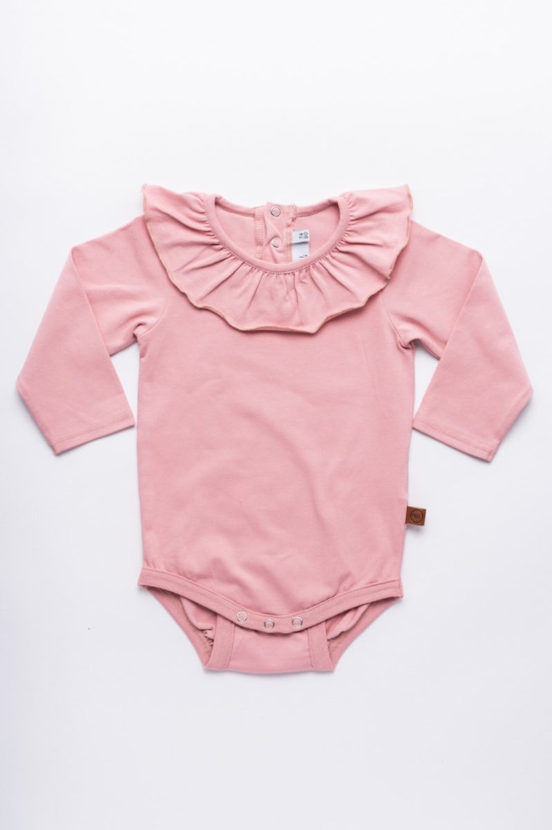Suloinen body single jerseytä frillakauluksella sävyssä Rose Tan. Nepparit selkäpuolella sekä tuplanepparit haaraosassa jotta voit käyttää lemppariasi pidempään. Sivusaumassa pieni tekonahkainen merkki, jossa MIVI kidsin logo.