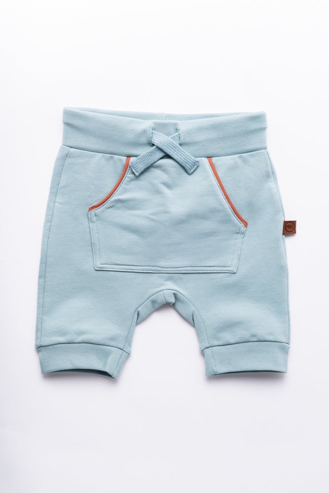 Asennetta uhkuvat collegeshortsit sävyssä Blue Surf. Edessä kengurutasku, jonka reunoissa ohuet tereet sävyssä Sierra. Vyötäröllä solmittavat nauhat, sivusaumassa pieni tekonahkainen merkki MIVI kidsin logolla.