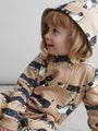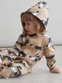 Mainion aw24 malliston ihanassa luomupuuvillaisessa pehmeässä huppuhaalarissa on Jogdog -painokuosi. Hihansuissa ja lahkeensuissa on resorit. Haalarissa on vetoketju. Koko vastaa tuplakoon suurempaa kokoa.