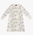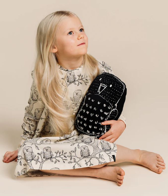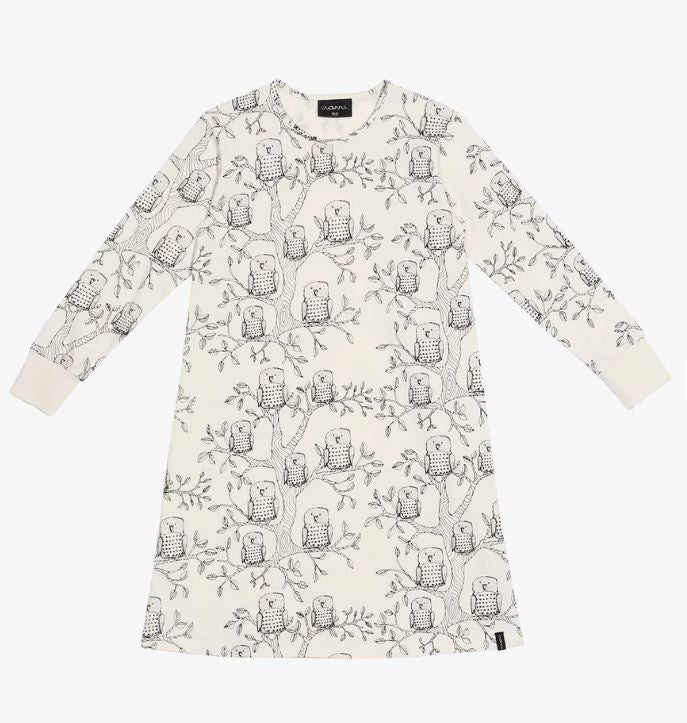 Shane on pitkähihainen yöpaita, jossa on rento ja mukava mitoitus. Hihansuissa reilun mittainen resori, joka on mukava ja helppo kääntää hihojen ollessa vielä pitkät. Kääntömahdollisuus pidentää myös yöpaidan käyttöikää. Korkealaatuisen kankaan pohjaväri on luonnonvalkoinen ja Pöllö -printti on musta.