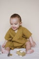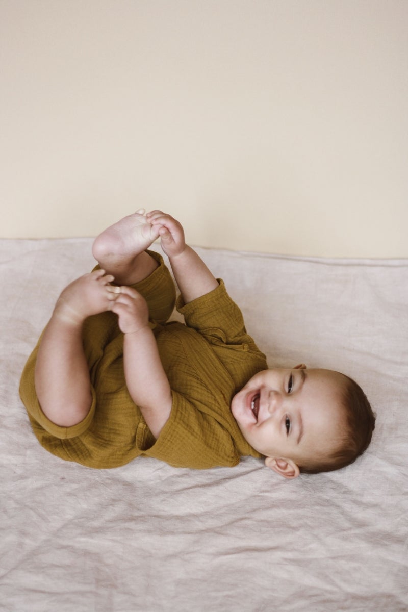 Ihanan kevyt ja söpö musliinipuku pikkuiselle. Haarassa nepparit jotka helpottaa vaipan vaihtoa.